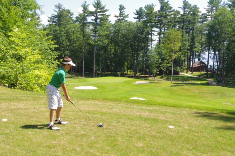 Brian Cavanaugh hits a tee shot from an elevated tee box to a bunker-protected green. Sebago Lake can be seen through the trees in the distance.The Donohue clan of Sebago is opening their private golf course to the public for a Spaulding Memorial Library fundraiser on Saturday, July 27. The event will feature a putting contest, food and silent auction at the lakeside estate in Sebago. On one of the course’s greens above, from left, are David Donohue, his daughter Kimberly Cavanaugh, wife Pam Donohue, and grandchildren Katie and Brian Cavanaugh.Kimberly Cavanaugh, daughter of Pam and David Donohue, watches her son Brian tee off while his sister Katie watches.