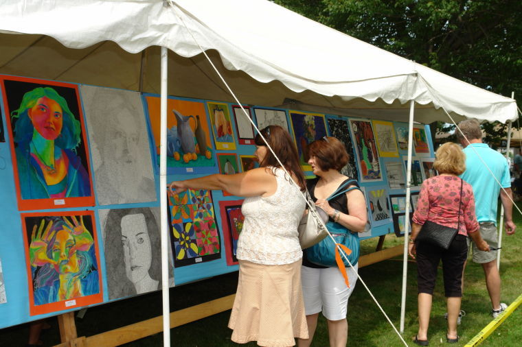 Patrons of last year’s Art in the Park event in South Portland peruse the student art tent. Each year the show exhibits works by students, selected and matted by local art teachers. Event judges award six $30 prizes to high school artists exhibited at the show. In lieu of individual awards for elementary and middle school students, Art in the Park gives a $50 award to each art teacher to help buy class supplies.