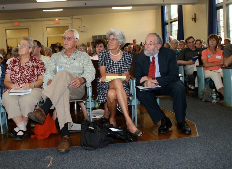 Among the crowd of 450 who attended a public hearing on a proposed Waterfront Protection Ordinance on Monday at Mahoney Middle School were three key opponents of the anti-tar sands oil measure, including, in the front row starting second from left, Deake Street resident Robert Sellin, co-chair of grassroots group Protect South Portland; his wife, Natalie West, who authored the measure; and Cape Elizabeth attorney David Lourie, who wrote the initial draft.