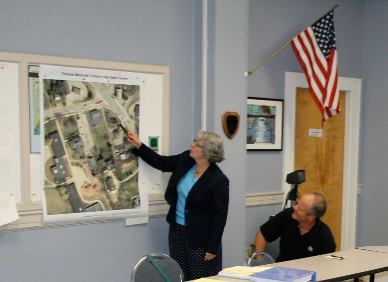 With Town Councilor Frank Governali looking on, Cape Elizabeth Town Planner Maureen O’Meara, left, reviews an aerial map of the Thomas Memorial Library property on Monday, during a joint meeting of the library and downtown center planning committees.