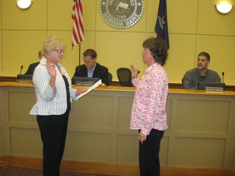 Gorham’s retiring Town Clerk Connie Loughran, left, on Tuesday administers oath of office to Jennifer Elliott as acting town clerk.