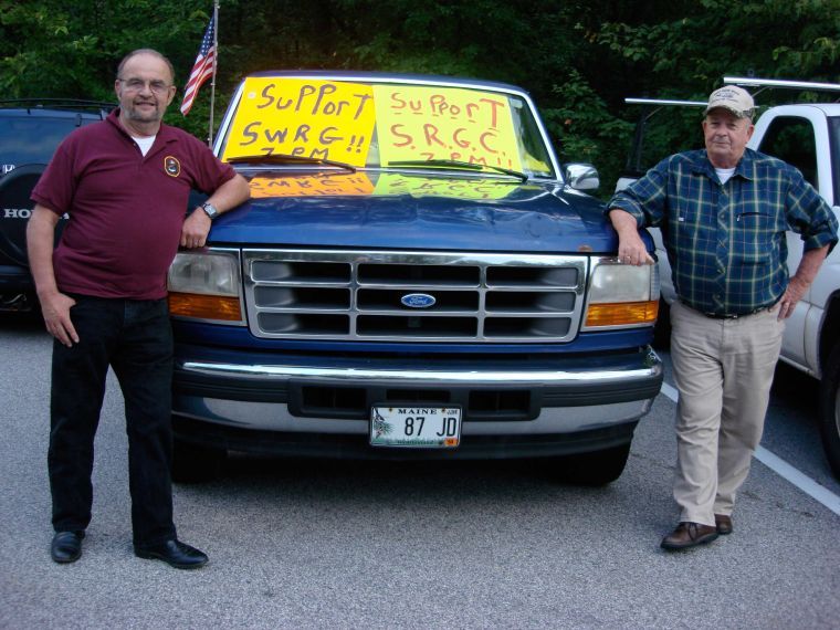 Don Burke, left, and Jim Sullivan stand by a pick-up belonging to Gary E. Morin, festooned with signs of support for the Spurwink Rod and Gun Club prior to a Cape Elizabeth Town Council workshop session last week that was called to mediate longstanding disputes between the club and its Cross Hill development neighbors.