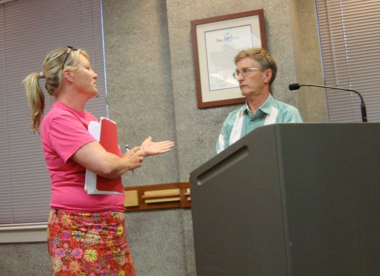 Suzanne Foley-Ferguson, a leading voice in the group Dog Owners of Greater Scarborough, questions Mark McCollough, an endangered species biologist with the Maine Field Office of the U.S. Fish and Wildlife Service, about his agency’s desire for a stronger leash law on local beaches, during the Sept. 4 Scarborough Town Council meeting.