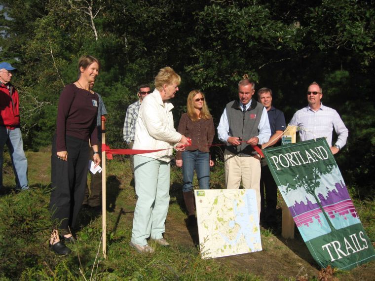 Westbrook Mayor Colleen Hilton and Portland City Councilor Edward Suslovic snip the ribbon on Friday off Hutchins Drive as the Stroudwater Trail extends into Westbrook from Portland.