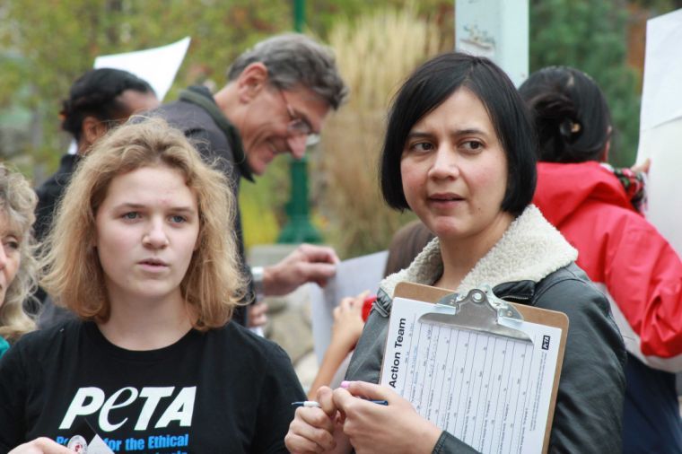 A dozen or so demonstrators from PETA, separated from the entrance by police barricades, stood outside the restaurant distributing literature in support of their cause.