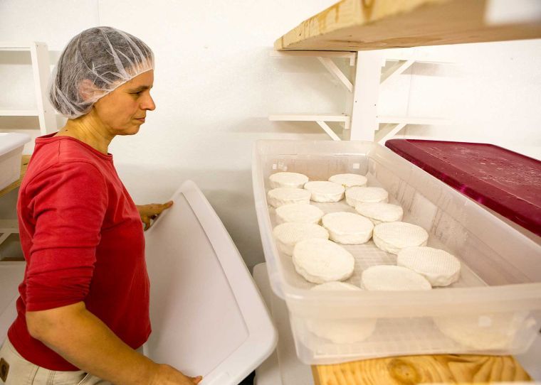 Cheese production manager Dorothee Grimm checks the progress of Camembert cheese wheels curing at Silver Moon Creamery in Westbrook, which is hosting an open house Sunday.