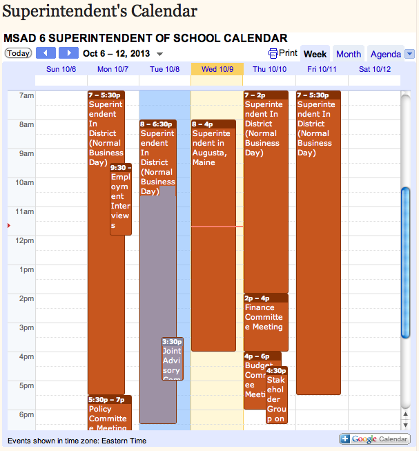 Frank Sherburne, superintendent of the Bonny Eagle school district, has started posting his weekly calendar, distributing it online and in emails to municipal employees and the local media. This week’s calendar is seen above.