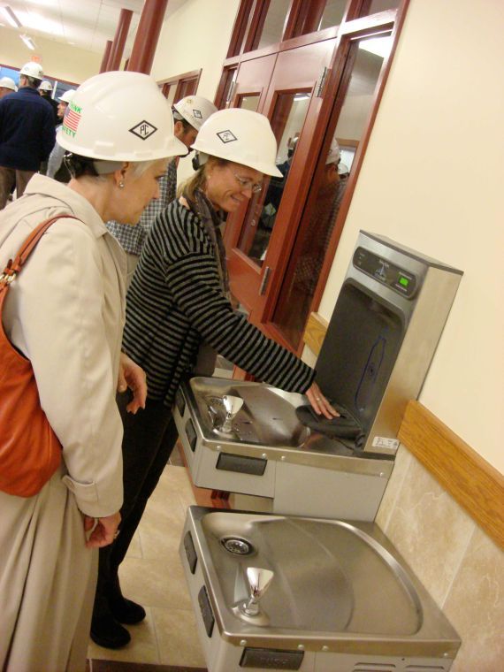 South Portland City Councilor Linda Cohen and school board member Sara Goldberg check out a water fountain, built with a motion-activated spout to fill water bottles, during an Oct. 16 tour of the new building, still under construction.
