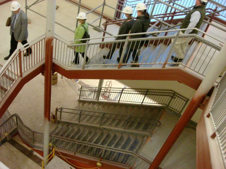 South Portland city councilors and school board members descend the central staircase in the newly constructed wing of South Portland High School, from the upper two class room levels – colored blue for sky on the top floor and green for grass on the first floor – to the lower level, colored red for ground. At this level, the main entrance will be locked down each day once students arrive, with visitors allowed entry only after visual confirmation at the new front office.
