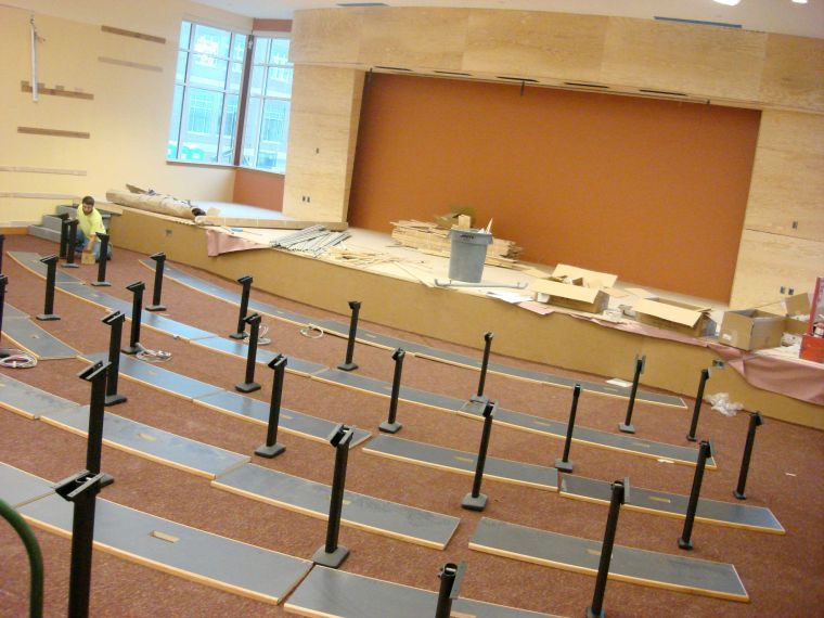 A worker from PC Construction attends to detail in the new conference room being built at South Portland High School, where posts are in place for the technology-enabled tables soon to be delivered. On Monday, the City Council awarded a $27,200 bid for the room’s audio system to ProAC Systems of Portland.