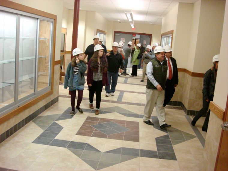 Led by City Manager Jim Gailey, South Portland city councilors and school board members tour the new classroom wing at South Portland High School. One challenge for the school once it opens, said Superintendent Suzanne Godin, will be filling the display cases such as the one at left. The school had been purposefully filled with such cases to display student work.