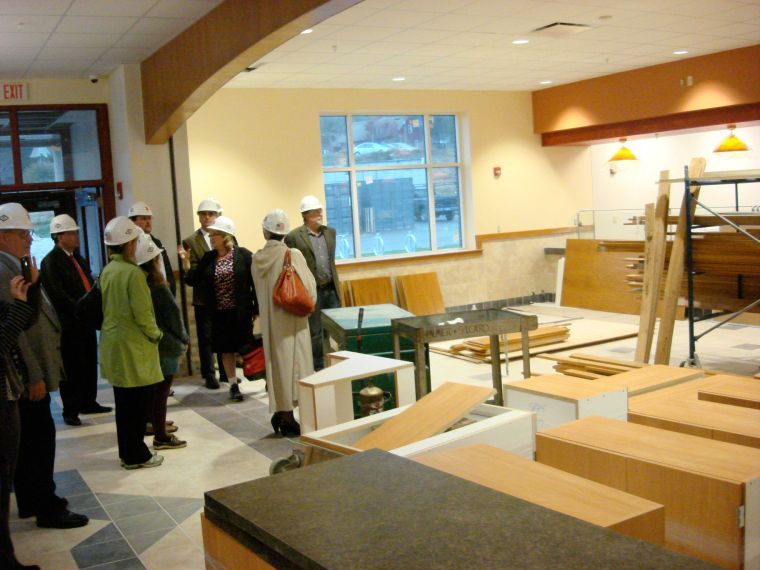 South Portland School Superintendent Suzanne Godin, center, shows off the new cafeteria line being built at South Portland High School.