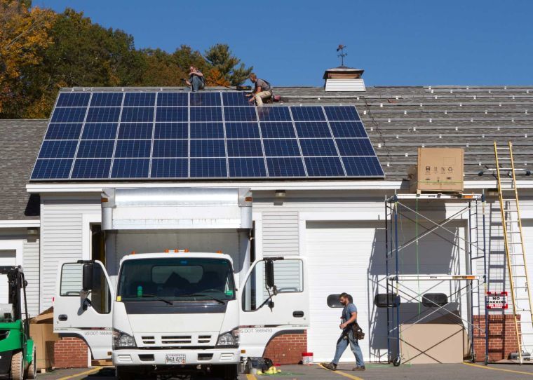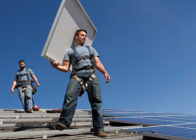 Seth Kieran, in foreground, and Joe Maisonave, installers for ReVision Energy.