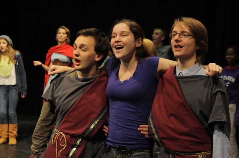 First-time Freeport High School theater director Simon Skold is at the helm for the musical comedy “The Boys From Syracuse.” The production will run from Nov. 7-10.Freeport High School students, from left, Daniel Sinclair, Deidre Sachs and Dalton Sinclair, rehearse the the upcoming musical comedy, “The Boys from Syracuse.”