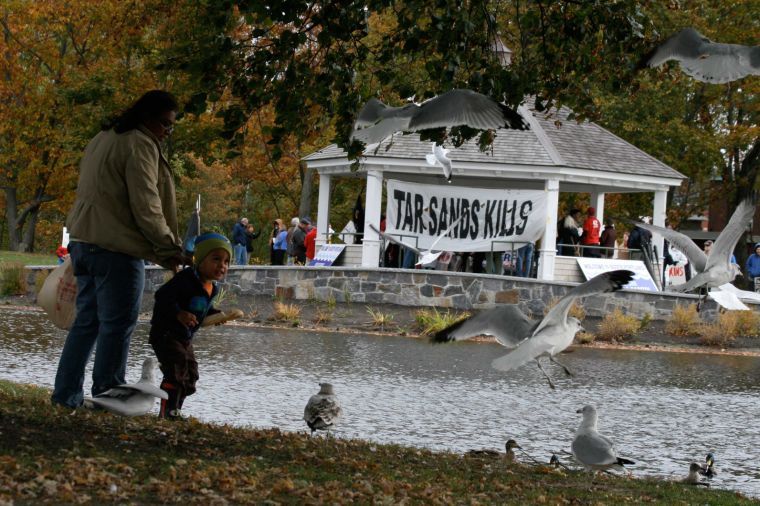 On Saturday, she and her son Matthews Germana, 3, were feeding the birds in Mill Creek Park while members of the environmental group 350 Maine staged a rally across the pond. Hung from the park gazebo was a large banner emblazoned with the words, “TAR SANDS KILLS.”