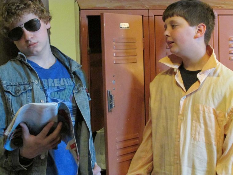 Cameron Wood, left, and Joe Begos rehearse a scene from “The Three Piggs,” presented by Fairy Tale Players at Acorn Studio Theater in Westbrook, Saturdays at 11 a.m. and Sundays at 2 p.m. from Nov. 9-24.