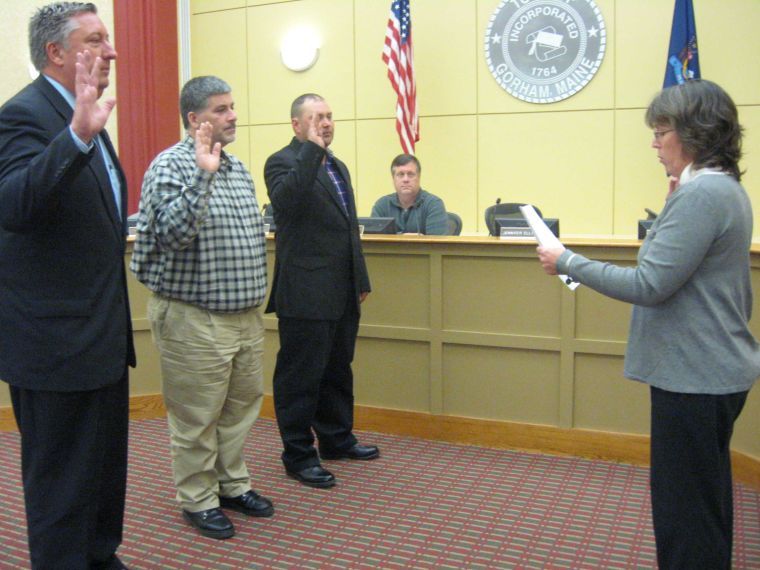Jennifer Elliott, acting town clerk, on Tuesday administers the oath of office to Gorham’s town councilors elected last week. They are, from left, Bruce Roullard, Matthew Robinson and Benjamin Hartwell.