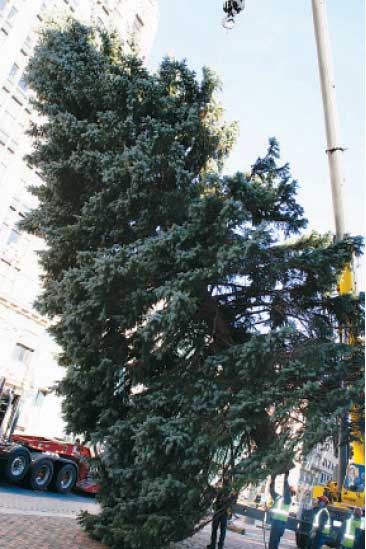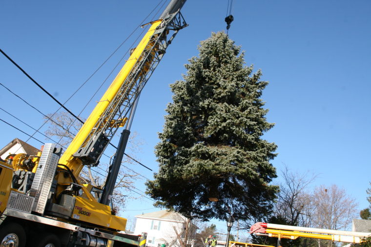A 55-foot-tall blue spruce is taken from its home at McLean Street in South Portland Nov. 21 using a crane donated by Keely Crane Services for transport to display in Portland’s Monument Square throughout the 2013 holiday season.