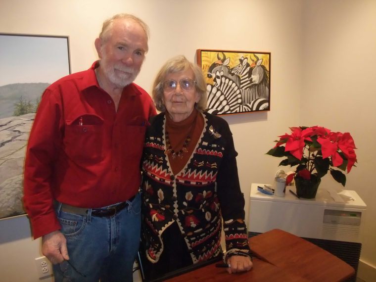 Tom Crotty, owner of Frost Gully Gallery in Freeport, and artist Dahlov Ipcar take a moment together during a Nov. 17 reception at the gallery.