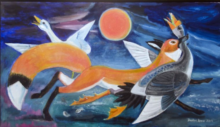 “The Fox is on the Town” is one of the new Dahlov Ipcar paintings on display at Frost Gully Gallery in Freeport.
