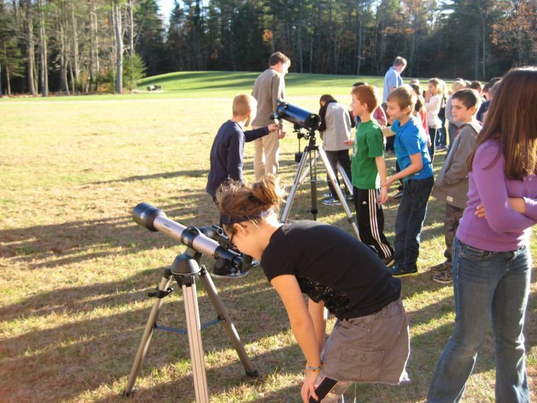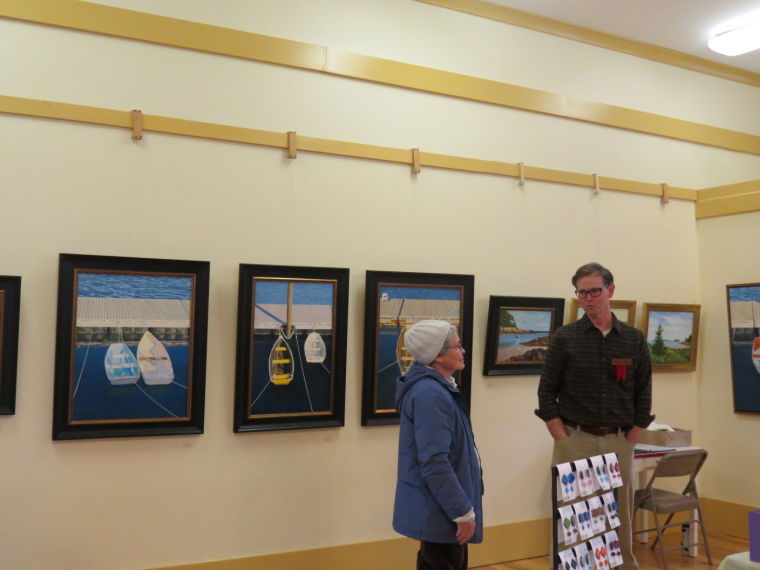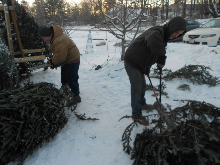Wood turner Peter Asselyn and his wife Sandra, of Durham, speak with a customer at the 15th annual Holiday Show and Sale of Fine Arts & Crafts, held Dec. 7-8 at Mallett Hall in Pownal.  Martha Mourkas gathers Christmas decorations to place for viewing inside the case next to the cash register, at the Freeport Community Services Thrift Shop. Andy Wilbur of Freeport, left, and Jordan May of Portland  trim Christmas trees at A. Wilbur’s Farm Stand in Freeport.  Artist John Bowdren of Pownal stands in front of his paintings, with Pownal resident Sherry Dietrich, during the 15th annual Holiday Show and Sale of Fine Arts & Crafts, held Dec. 7-8 at Mallett Hall in Pownal.  Fourth-graders from Durham Community School spent time in the fall learning about the sun, moon and stars, and their relationship with Earth in the solar system. Last month, they went out to the soccer field to use the telescopes at a stargazing party. Another stargazing party is planned for next spring.