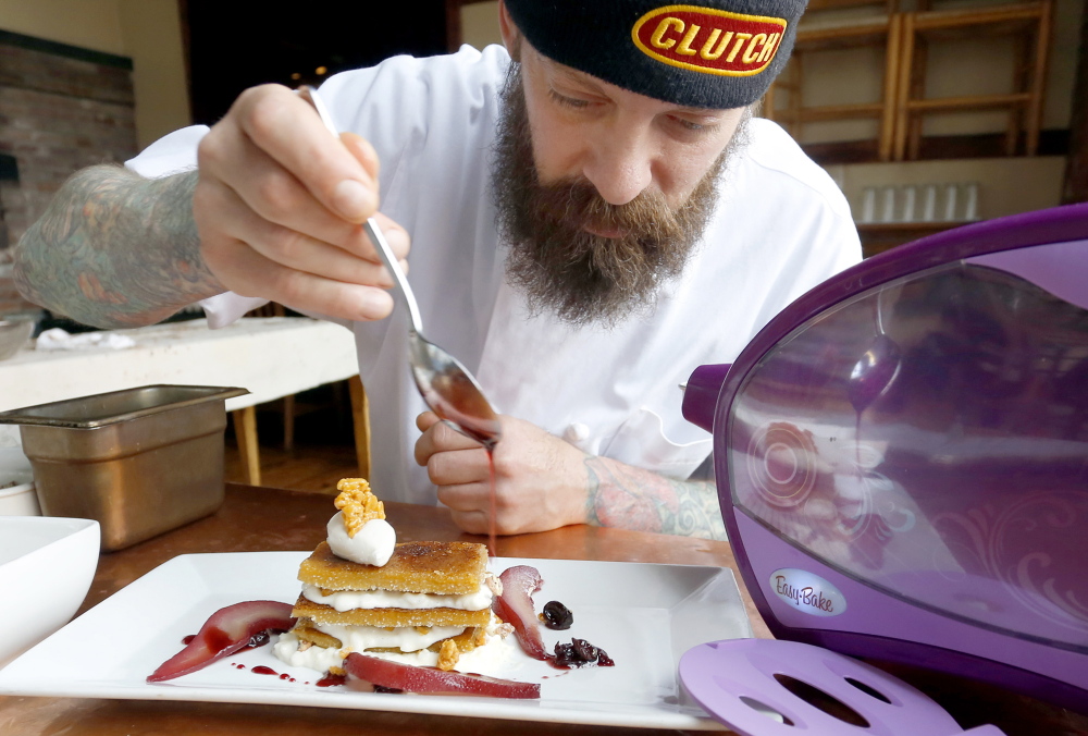 “That’s perfect for custard,” Dadaleares said. So the chef made six custards, topped them with some turbinado sugar and torched them. (It took 15 to 20 minutes for each custard to bake.) He chose the three best, and layered them with vanilla rice pudding, caramelized Rice Krispies, candied pecans, port-poached pears and cherries. He topped his Easy-Bake napoleon with sweetened whipped cream.