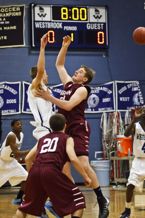 Westbrook’s Chris Connolly and Gorham’s Sam Kilborn fight for the opening jump-ball Friday.