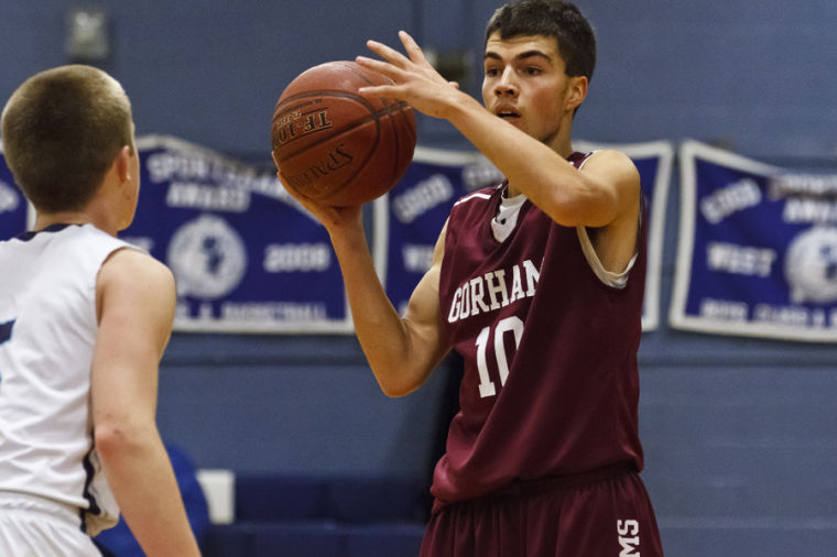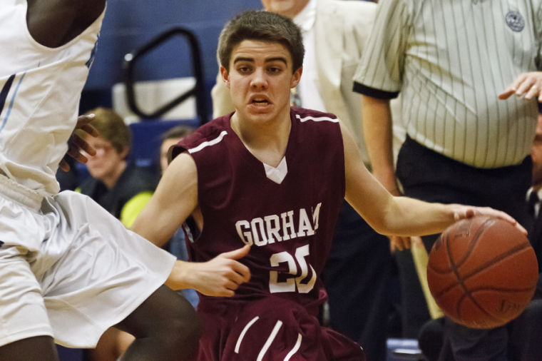 Gorham’s Cody Elliot pushes inside on the attack against Westbrook. Gorham fell to the Blue Blazes 52-40.