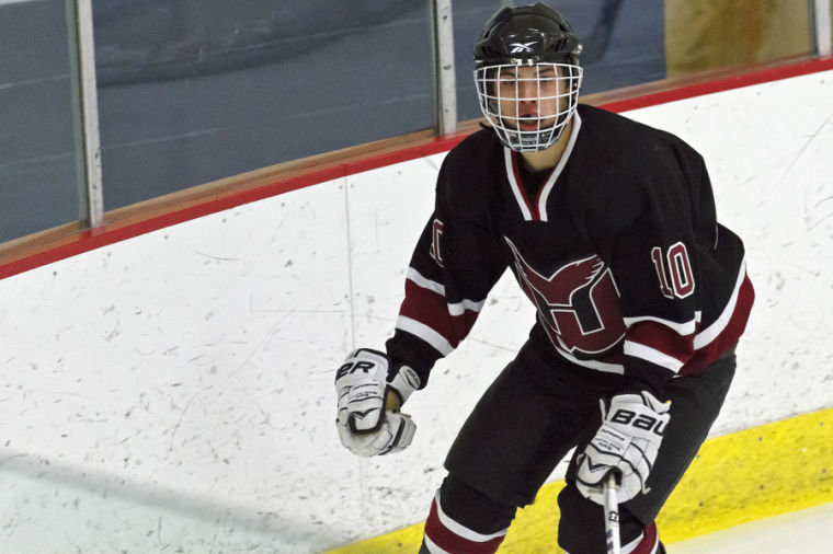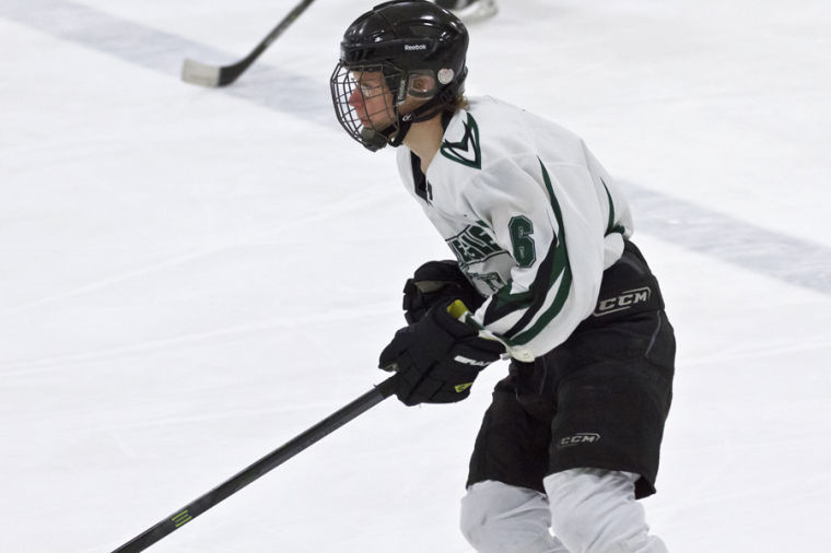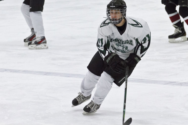 Bonny Eagle senior defenseman Paul Emmons tracks the action in the neutral zone.