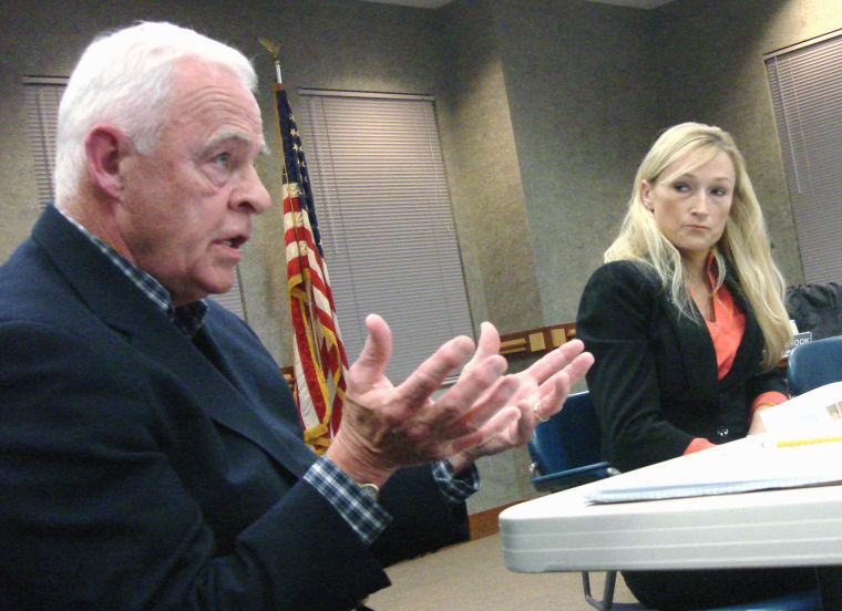 As Scarborough Town Councilor Kate St. Clair looks on during a council workshop Wednesday, Feb. 19, Councilor Bill Donovan makes a point about final report of the town’s ad hoc Animal Control Advisory Committee, on which he served.