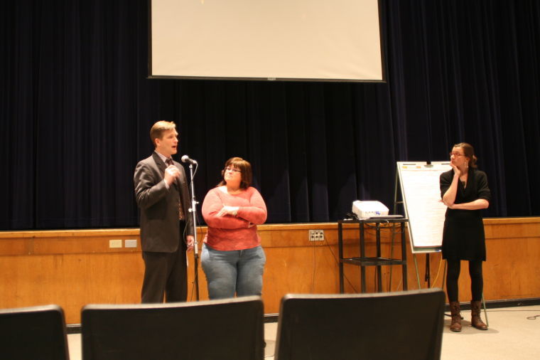 City Councilor Brendan Rielly and Westbrook resident Krista Martin share concerns during a community forum in the Westbrook High School auditorium Monday. Nicole Manganelli, right, facilitated the discussion.