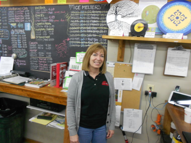 Kristin Bernhart, owner of Freeport Hardware, stands near the store’s display of art that she created and will donate to the Sitting Pretty fundraiser to support the Port Teen Center, on Sunday, March 23, at the Freeport Community Center.