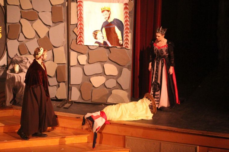 Ethan Whited, who plays the king in the Freeport High School Drama Club production of “UnHappily Ever After,” and Sarah Watts, who plays the queen, stare at a fallen mannequin. The mannequin represents Snow White, the queen’s former self, in the student-written play. The students performed the play Saturday at the Maine Drama Festival finals.
