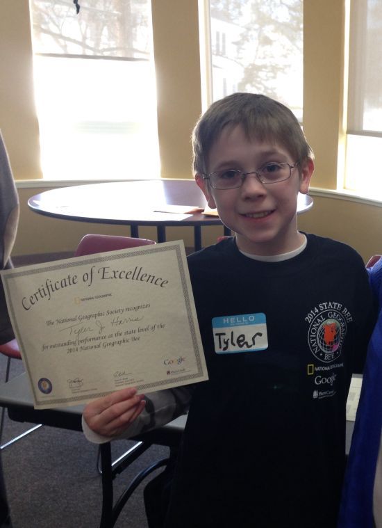Durham Community School fifth-grader Tyler Harris placed fourth in the Maine State National Geographic Bee, held at the University of Maine at Farmington on April 4. Harris took the National Geographic test, placing in the top 100 for the state, and was invited to participate in the state bee for the second year in a row. The top 100 students are separated into groups of 20 kids each for the preliminary round of the bee, and then the competition is narrowed down to 10 students. Following the tie-breaker round, he got five of six questions correct, and qualified for the finals. He answered six of eight questions correctly in the finals. His goal for next year is to win the Maine State National Geographic Bee and travel to Washington, D.C., for the national competition. Harris hopes to either be a geographer or a meteorologist one day.