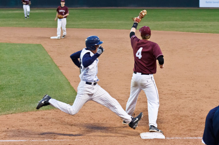 Andrew Schmidt makes the play at first just ahead of the Portland runner.