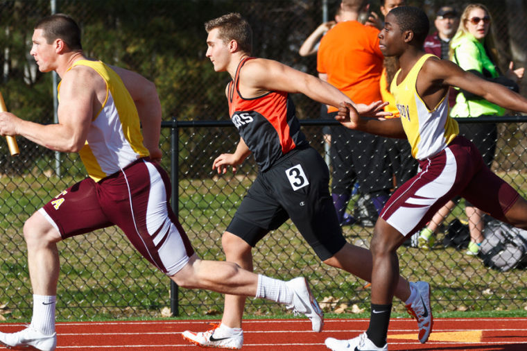 Thornton’s Jabari Washington hands off to teammate Andrew Libby during the boys 4×100 Relay.