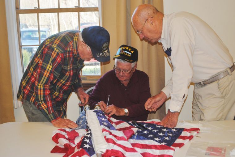 Allie Davis left, Walter Braley, middle, and Roger Timmons, members of the Field-Allen American Legion Post 148 in Windham, finish assembling about 100 American flags to be placed on utility poles throughout the town, beginning Saturday, May 17. Post members will meet at the fire station in North Windham and in teams of two or three will place flags on utility poles on the roadways.