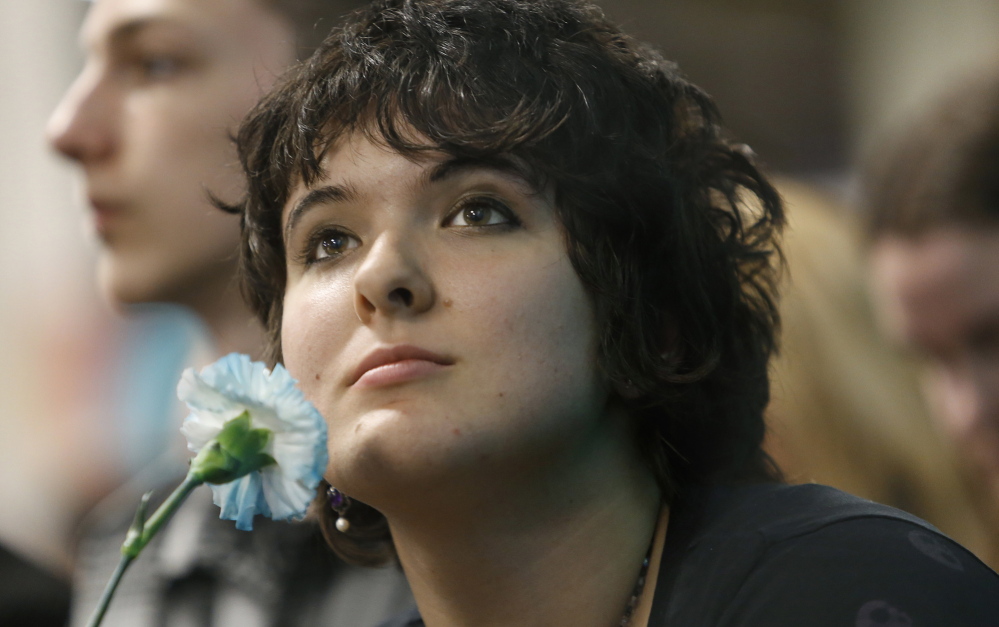 Eden Dyer, a commercial art student from Casco Bay High School, looks up in the crowd for her grandmother after receiving her diploma and a carnation during the Portland Arts and Technology High School commencement.