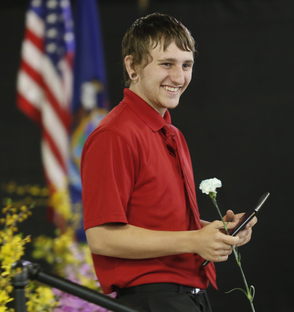 Kristopher Barbour, an automotive tech II student from Gray-New Gloucester High School, smiles at his classmates after receiving his diploma Friday.