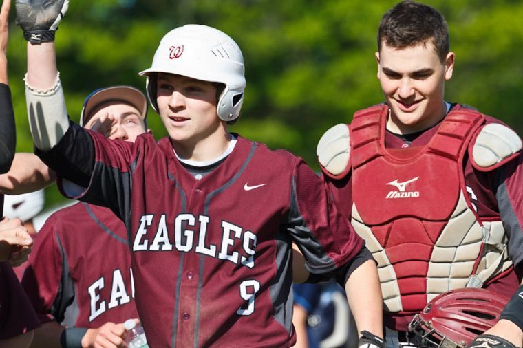 Eagle Tanner Laberge soaks in high-fives and pats on the back after crossing home to tie the score with Westbrook Thursday.