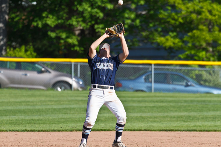 Blazes third baseman Austin Blake reaches to grab an infield fly at Windham Thursday.