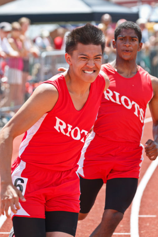 Red Riots teammates Michael Cuesta and Anthony Tran trade the baton for the last leg of the 4×100 Relay Finals. South Portland took 10th.