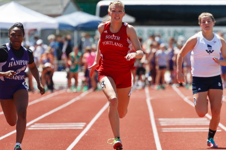 South Portland’s Lauren Magnuson outpaces Hampden and Westbrook competitors in the 100 Prelims; Magnuson took second in the Finals.