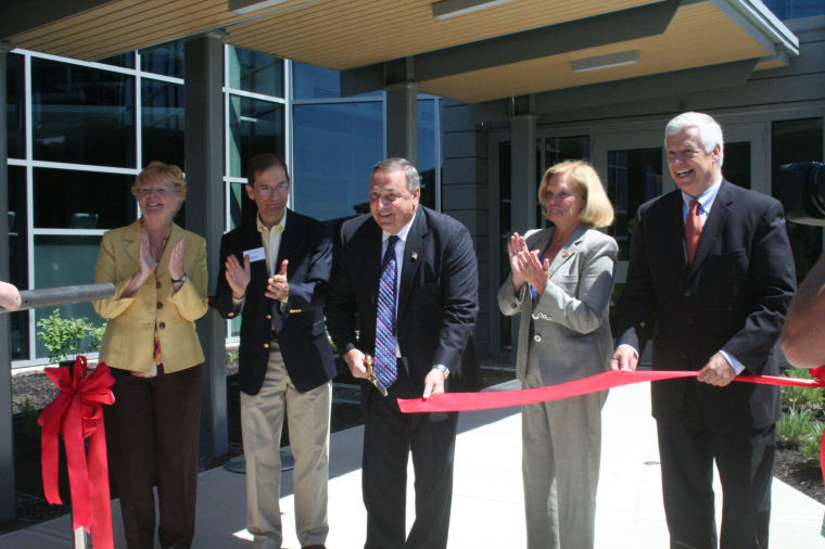 All smiles during a ribbon-cutting ceremony Friday for Idexx Labratories’ $35 million expansion are, from left, Westbrook Mayor Colleen Hilton, Idexx President and CEO Jonathan Ayers, Gov. Paul LePage, U.S. Rep. Chellie Pingree, and U.S. Rep. Mike Michaud.