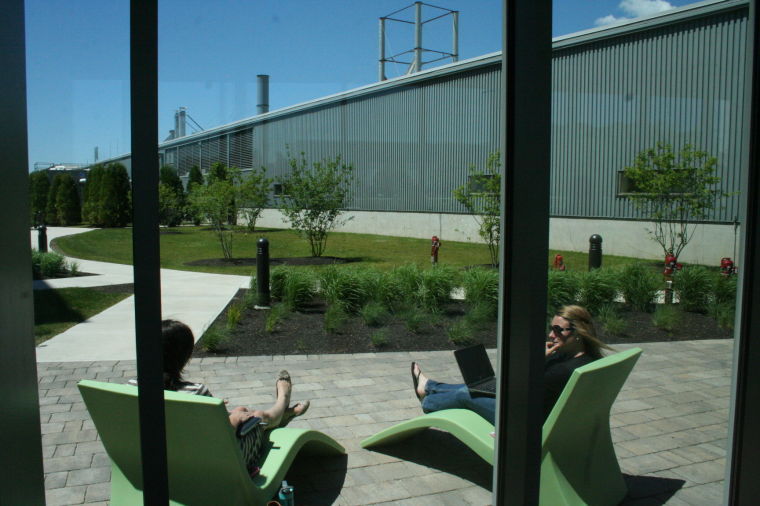 Two Idexx employees sit and work remotely Friday outside the company’s new expansion. The courtyard connects the new “Synergy Center” with the previous addition at the Five Star Industrial Park, off Eisenhower Drive in Westbrook.