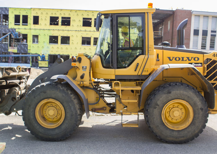One of several large dumpsters collecting construction debris at the front of the high school is carted away for dumping.