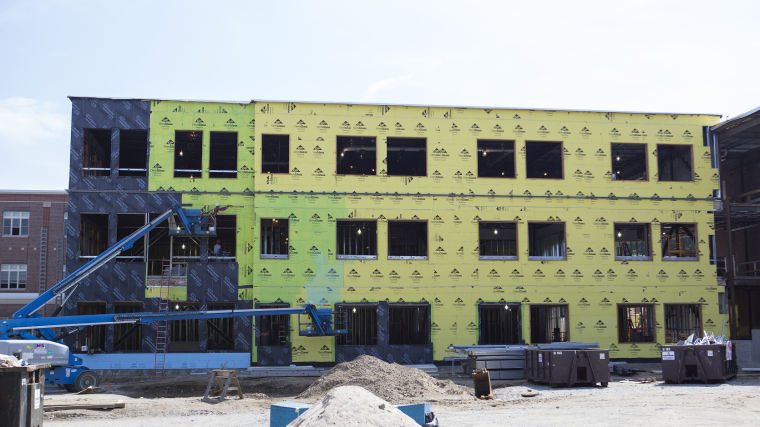 A wide shot of a classroom wing shows the scope of the renovation and construction under way at South Portland High School.