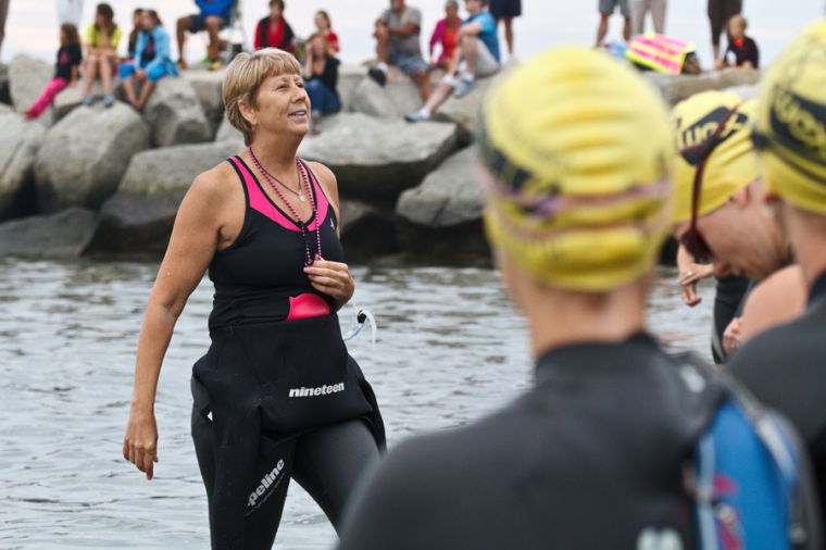 Meredith Strang-Burgess of Cumberland – and bearer of bib No. 1 – gave instructions and encouragement to each wave of competitors just before they took the plunge.