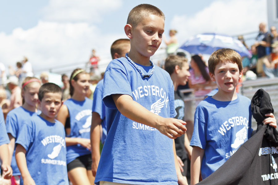 Athletes from Westbrook march ’round the track during the midday parade.
