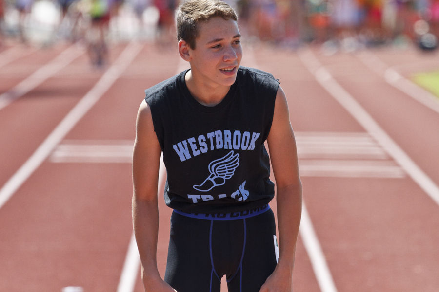 Westbrook’s Dominic Creenan catches his breath after winning the 15-and-under boys 100-meter dash.